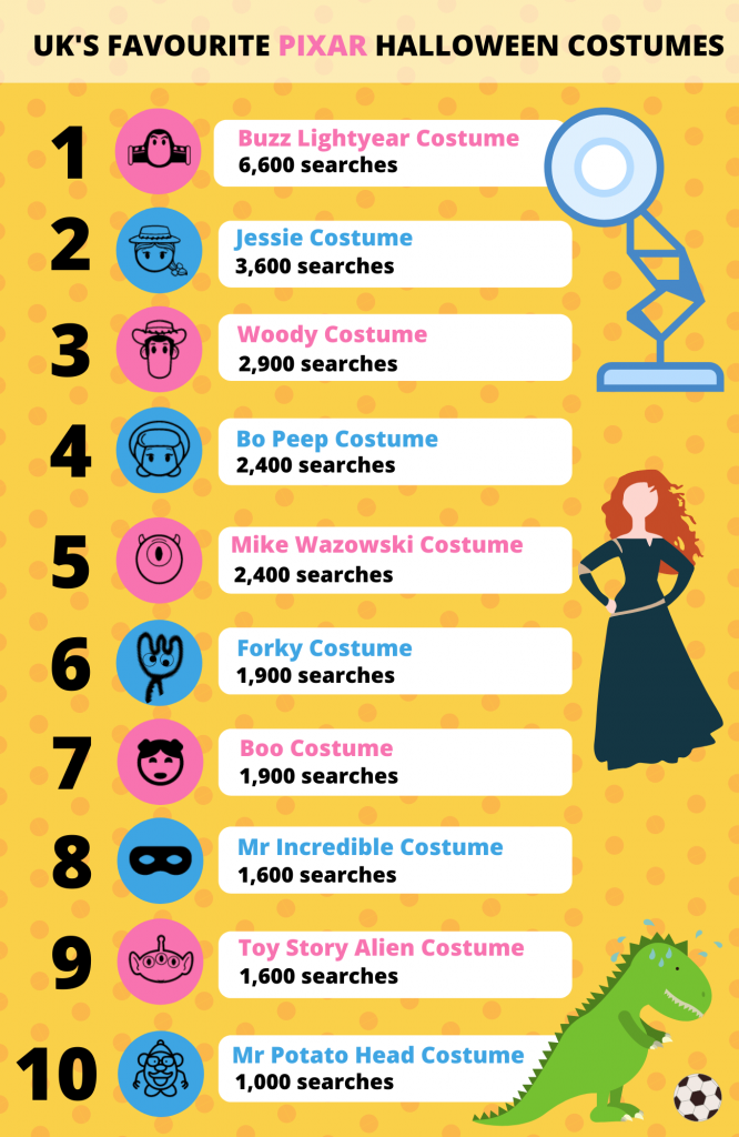Predictably, Toy Story, one of Disney’s highest-grossing movie franchises, dominates the top 10 costumes list, with even lesser-known characters like Bo Peep coming in ahead of heroes like Mr Incredible and Mike Wazowski, from Monsters Inc. Buzz Lightyear was, of course, the winner in this category, followed closely by love interest, Jessie, and partner in crime, Woody.